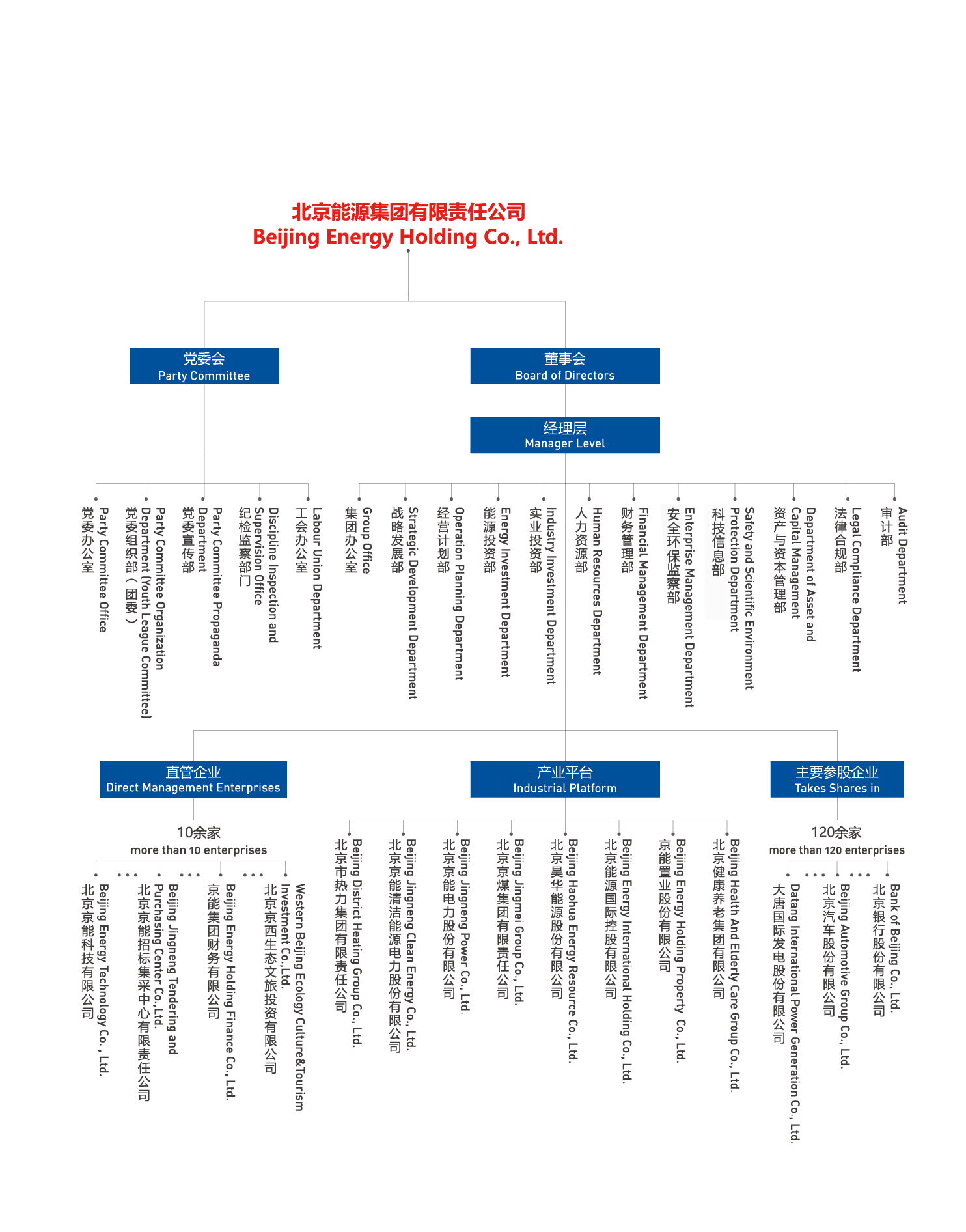 北京能源集團(tuán)有限責(zé)任公司(以下簡稱“京能集團(tuán)”或“集團(tuán)”)是北京市人民政府出資設(shè)立的國有獨資公司,肩負(fù)著保障首都北京能源安全可靠供應(yīng)的重任。集團(tuán)成立于2004年,由原北京國際電力開發(fā)投資公司和原北京市綜合投資公司合并而成,2011年、2014年先后又與北京市熱力集團(tuán)有限責(zé)任公司、北京京煤集團(tuán)有限責(zé)任公司實施合并重組,實現(xiàn)了產(chǎn)業(yè)鏈條融合互補(bǔ)。經(jīng)過多年的資源整合,集團(tuán)由單一能源產(chǎn)業(yè)發(fā)展為熱力、電力、煤炭、健康文旅等多業(yè)態(tài)產(chǎn)業(yè)格局。2024年底,集團(tuán)資產(chǎn)規(guī)模達(dá)4934億元,年營業(yè)收入975億元,全資及控股企業(yè)860余家,參股企業(yè)120余家,擁有員工3.4萬余人,投資區(qū)域遍布全國33個省市區(qū)以及海外,控股京能清潔能源、京能電力、昊華能源、京能置業(yè)、北京能源國際、京能熱力六家上市公司,盈利水平長期穩(wěn)居北京市屬企業(yè)前列。2024年在中國企業(yè)500強(qiáng)排名第247位,中國服務(wù)企業(yè)500強(qiáng)排名第87位。
